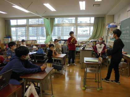 15日(月)、6時間目のクラブ活動の様子です。写真は上から、球技クラブ、パソコンクラブ、歴史クラブです。球技クラブだけは雨のため、3階のホールでGボールや紙玉投げをしました。