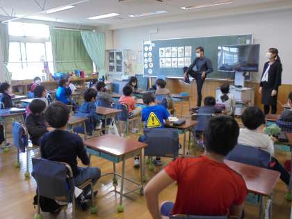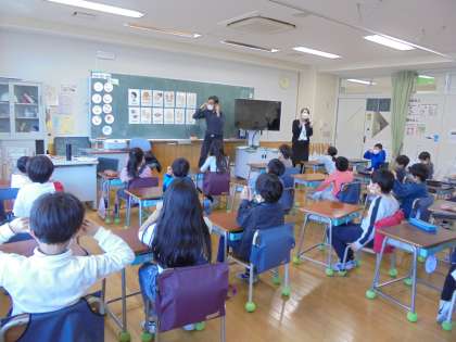 17日(水)の2時間目、2年1組は外国語活動の時間でした。今回は、頭、目、肩などの体の名前の表現を学びました。後半は、医者と患者とに分かれて、英語でやり取りをしました。
