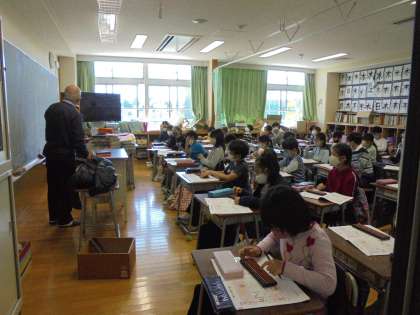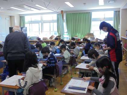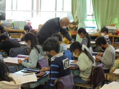 18日(木)の3時間目、3年1組は算数の時間でした。そろばんの学習の3回目です。今回は、3桁+2桁、3桁−2桁の計算をしました。講師の先生がおっしゃる「5があるじゃないか」の言葉を子どもたちもまねしながら、操作を覚えていきました。