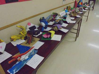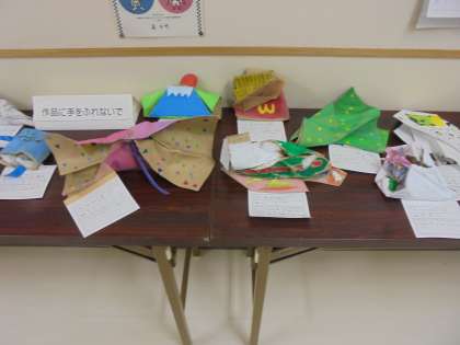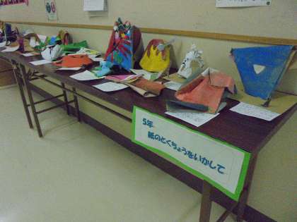 5年生の作品「紙のとくちょうをいかして」を職員室前の廊下に展示しました。より多くの子どもたちに見てほしいということから、職員室前にしました。元は同じ大きさのダンボール紙です。それを水にぬらして柔らかくし、形をつくって乾燥させてから、色を付けました。一人一人の個性が光っています。