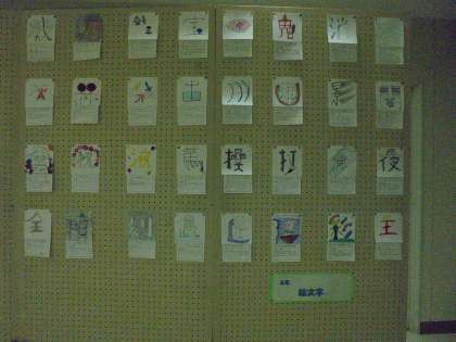 6年生の作品「絵文字」が完成し、1階ホール近くに飾りました。漢字一字が入る絵文字です。漢字の意味をよくとらえた作品になっています。休み時間など、子どもたちが足を止めて作品を見ていました。