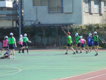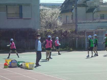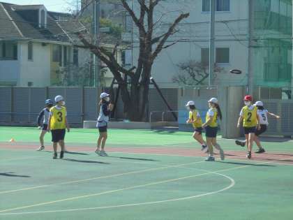 19日(金)の2時間目、6年1組は体育の時間でした。校庭で「アルティメット」のゲームに取り組んでいました。チーム内での声掛け等連携がよくできていました。