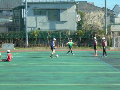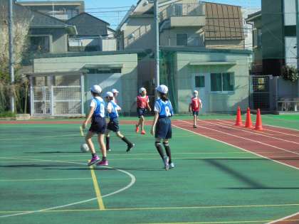 19日(金)の6時間目、4年2組は体育の時間でした。準備運動後、校庭を3周走ってから、「ゴール型ゲーム」に取り組んでいました。最初にチーム内での練習を行い、その後、ゲームをしました。