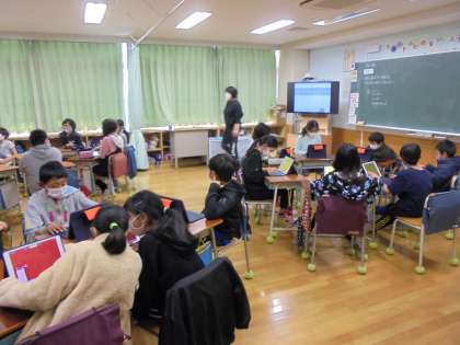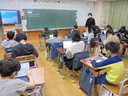 22日(月)の2時間目、4年2組は学級活動の時間でした。体育の時間に取り組んだサッカーチームの再編成に向けた振り返りを行いました。担任の先生が撮影した動画を見たり、タブレット型端末のロイロノートで感想を書いたりしました。チーム再編成の発表映像が流れた際は、大盛り上がりでした。