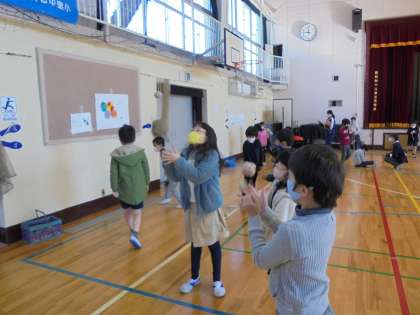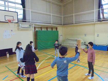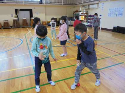 24日(水)の1・2時間目、2年2組と1年1組は体育館で昔遊びをしました。教えるのは2年生です。6つのコーナーがあり、1年生がお客さんになって時間で移動しました。写真は上から、お手玉、けん玉、羽根つきの様子です。