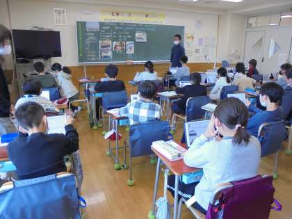 24日(水)の4時間目、4年1組は社会科の時間でした。「世界とつながる大田区」の学習をしています。大田区は外国の都市とどのような交流をしているのかをタブレット型端末を使って調べました。最後に、「なぜ国際交流に力を入れているのか」を一人一人が考え、ノートに書きました。