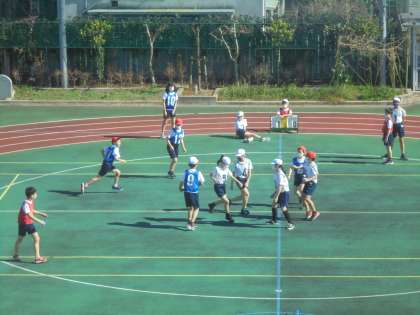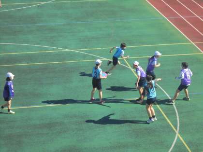 24日(水)の5時間目、5年1組は体育の時間でした。校庭で「アルティメット」のゲームに取り組んでいました。「いいよ。」「ナイス!」「こっち」など互いに声を掛け合いながら笑顔でゲームをしていました。