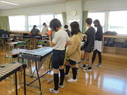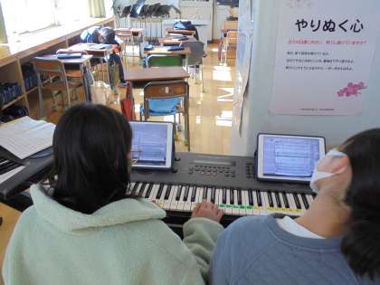 24日(水)の5時間目、6年1組は音楽の時間でした。「木星」の合奏練習に取り組んでいます。各自のタブレット型端末には、担当する楽器の楽譜や演奏の仕方が映像で送られているので、それを見ながら練習を重ねていました。