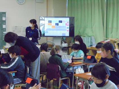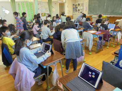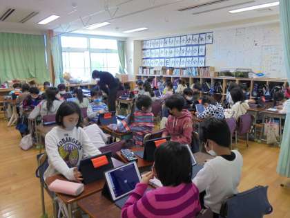 24日(水)の5時間目、3年1組は学級会の時間でした。今回は、タブレット型端末を使って、「6年生に感謝の気持ちを伝える方法を考えよう」と題して、自分の考えを入力しました。それをロイロノートに集約して、みんなでさらに方法をしぼっていきました。