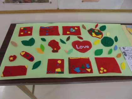 25日(木)、保健室前の廊下には手芸・クラフトクラブの作品が並びました。前日のクラブ活動で仕上げたものです。登校してきた子どもたちは「かわいい」「上手!」と言って眺めていました。