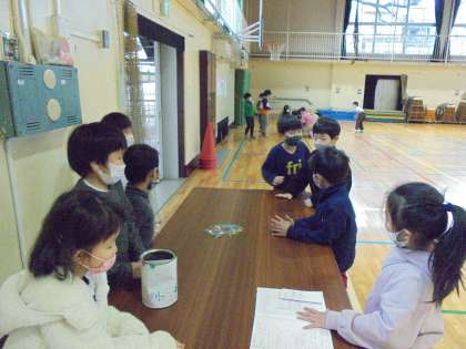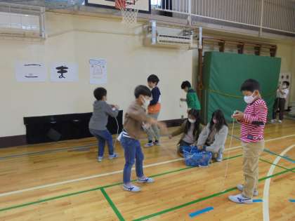 26日(金)の2時間目、1年2組と2年1組は生活科の時間でした。体育館で「昔遊び」を一緒に行いました。2年生が6つの遊びコーナーを準備して、1年生がグループごとに順番に回りました。「こうやるといいよ。」と実際にやってみせてあげる姿がたくさんありました。写真は上から、あやとり、おはじき、こまで遊ぶ様子です。
