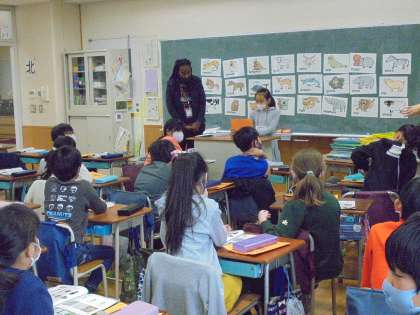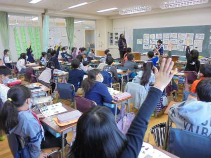 26日(金)の2時間目、3年1組は外国語活動の時間でした。今回から担当するALTが変わりましたが、子どもたちはいつもと変わらず落ち着いて臨みました。英語での3ヒントクイズを作り、順番に出題して答えを考えました。