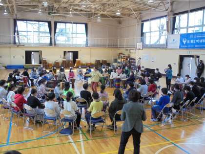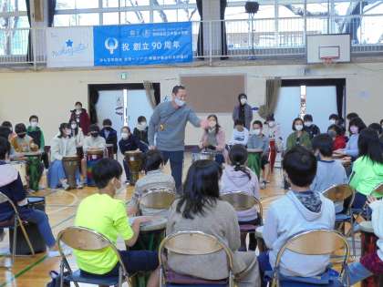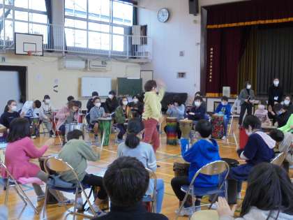 ドラムサークル体験、最後は、5年生と6年生でした。ドラムサークルは「いま、ここ」での活動ですから、その時の気持ちによって音の感じが変わります。高学年ということでファシリテーターからは、高度な音づくりが提案されました。円を四分割し、1拍から4拍までに分かれました。自由に叩きながら途中で合図を送られたグループがその拍数を叩くことをしました。全体の集中度が高まり、一体感が生まれました。