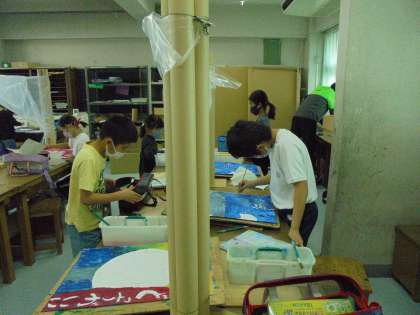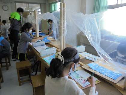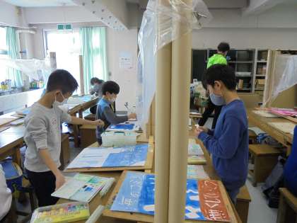 3月1日(月)の3・4時間目、4年1組は図画工作の時間でした。総合的な学習の時間に取り組んできた「SDGs」とコラボして、環境ポスターを描いています。画用紙が大きいため、目の前のビニールを上げています。