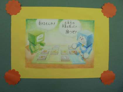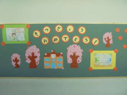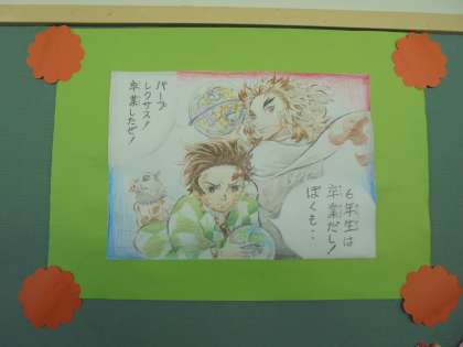 図工室に向かう新BOPの廊下に、6年生の卒業を祝うメッセージが飾られています。絵も飾りも職員の方の手作りとのことでした。コロナ禍のため、BOPの開設はできない1年でしたが、これまで一緒に遊んだ6年生にとプレゼントをしてくださいました。職員の皆さま、ありがとうございました。
