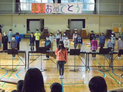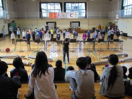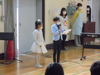 4日(木)の9時10分からは、3年生の「6年生を送る会」でした。2名の司会者がはっきりとした声で進行をしていきました。「はじめの言葉」は6年生の前に立ち、大きな声であいさつをしました。最初の出し物は、「パフ」を歌いました。指揮者に合わせて楽しく歌っていました。
