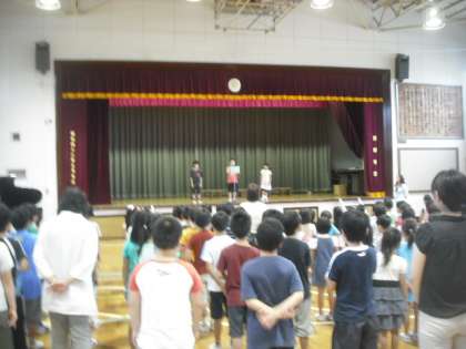 台風6号が心配されていますが、1学期終業式が行われました。校長先生から、1つ目 42日間でできることを探そう 2つ目 通知表には、頑張ったこと、これから頑張ってほしいことが書いてある。2学期にまた目標をもって努力してほしい 3つ目 震災についていろいろ考えてきた。自分にできることをこれからも進めていこう 4つ目 駒繋小学校での水泳はよく頑張った。いよいよ中里小のプールが8月後半に完成する。担任の先生から注意をよく聞いて楽しく水泳学習をしよう。 児童代表の言葉があり、終業式が終了しました。