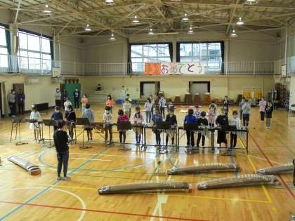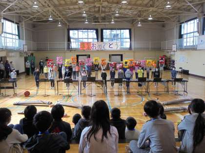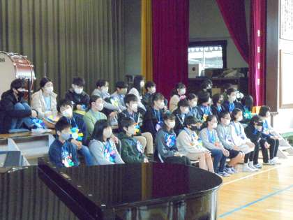 歌のプレゼントの次は、同じ曲で「合奏」をしました。6年生にとっては、懐かしい曲なので、リズムをとりながら聞いていました。最後は、お礼の言葉でした。「6年生卒業おめでとう!ありがとう!」の文字を一斉に掲げ、3年生みんなでお礼を述べました。文字の周囲に花飾りがあって、とてもきれいでした。