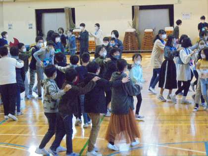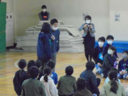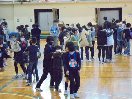 次は、じゃんけん列車をして6年生と一緒に遊びました。背の高い6年生の肩に手をのせる4年生、自分より背の低い4年生の肩に手を置く6年生、それぞれにすてきな姿でした。ゲームの勝者には、4年の先生から特別インタビューがあり、盛り上がりました。