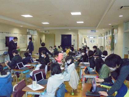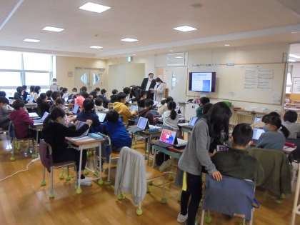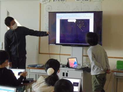 8日(月)の1・2時間目、4年生はプログラミング学習に挑戦しました。大阪大学、東京工業大学の先生方にお越しいただき、タブレット型端末を使って、「スクラッチ」の操作を学習しました。北極星を中心に星座に動きをつけました。2クラス同時に3階のホールで学習しましたが、寒さを感じさせない集中力がありました。