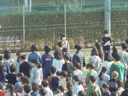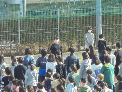 11日(木)の朝、校庭で「たてわり班引き継ぎ集会」を行いました。最初に6年生の代表がたてわり班活動の振り返りを話しました。次に5年生の代表が4月から最上級生として頑張るという話をしました。その後、各グループで6年生から5年生にグループ旗が手渡されました。