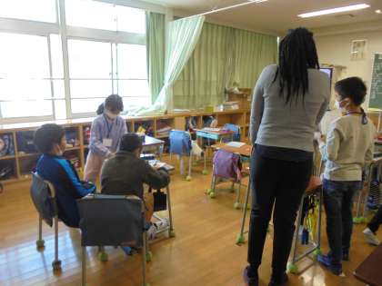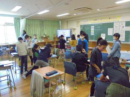 15日(月)の1時間目、4年1組は外国語活動の時間でした。ALTとの最後の授業です。時間を尋ねる活動をしていました。「何時に起きるの?」「何時に寝るの?」などを友達や先生に聞いて回りました。