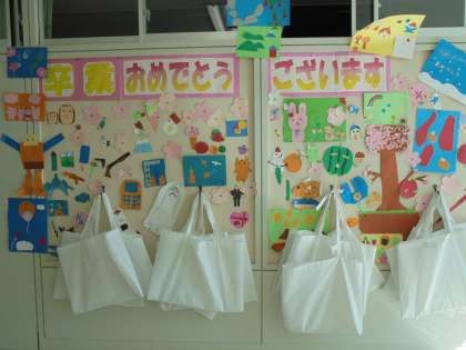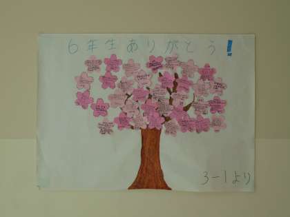 6年生の廊下には、5年生が作った卒業をお祝いする飾りが壁一面に飾られています。5年生が自主的に行ったのだそうです。5年生の優しい心にも感激します。また、6年生を送る会で3年生にもらった桜の木のメッセージも飾られています。