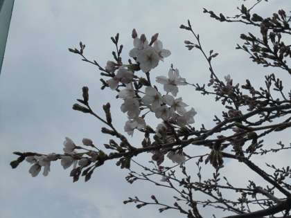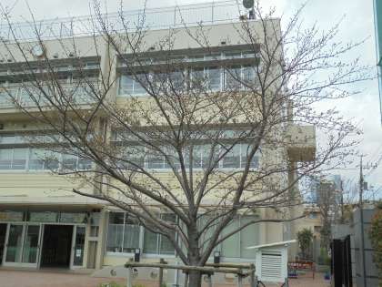 桜の開花が報じられています。中里小の桜を紹介します。正門近くの「80周年記念植樹の桜」の様子です。ほんのわずか咲いています。