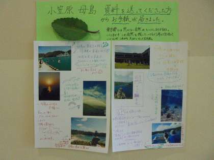 4年生が社会科の学習で取り組み、資料をいただいた小笠原の母島の皆様にお礼の手紙を届けたところ、手紙のお礼を頂戴しました。4年生の先生が廊下に掲示すると子どもたちは早速見に行っていました。美しい自然の写真も添えていただき、またまた感激した子どもたちでした。