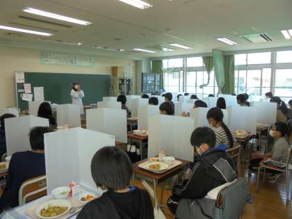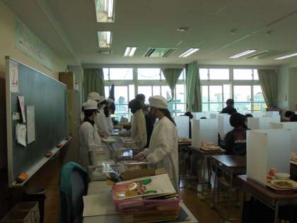 6年生にとっては、小学校で食べる最後の給食です。いつも通りの配膳が終わると「いただきます。」と挨拶をして食べ始めました。いつものように増量を望む行列ができました。