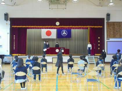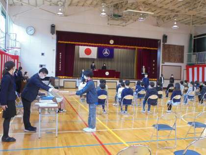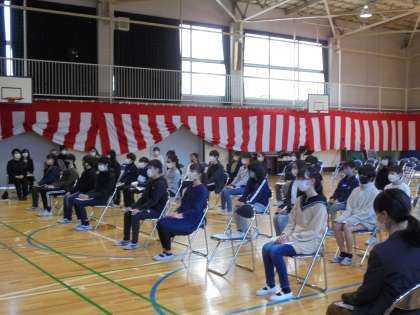 卒業式の予行では、卒業証書授与の練習を全員行いました。壇上で自分の思いを発表してから、証書を受け取ります。フロアで証書フォルダに入れてもらい、自席に戻ります。予行のため、フォルダは使わず画用紙で代用しました。
