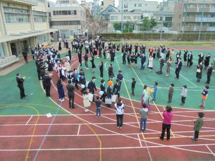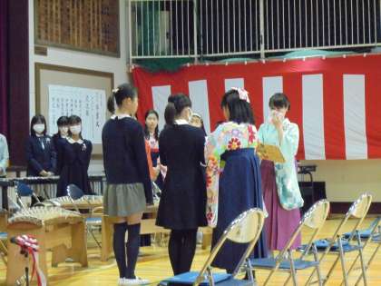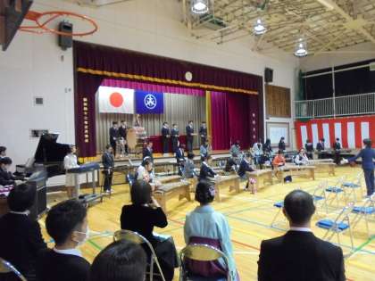 記念写真を撮影してから、第2部を行いました。第2部は、卒業生によるよびかけや「百花繚乱」の演奏を披露しました。子どもたちによるサプライズがあり、心温まる一時になりました。最後、保護者の皆様、教職員に見送られ、本校を巣立っていきました。