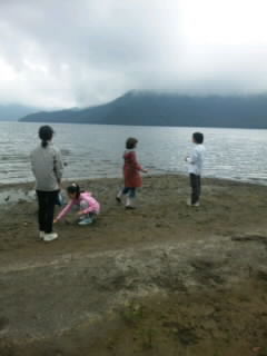 ハイキング無事終了。皆、よくがんばりました。お弁当を食べ、湖畔で汽船が来るのを待っています。