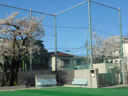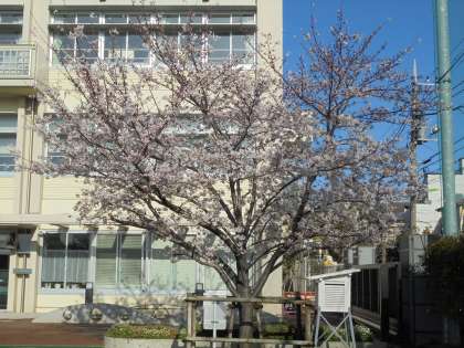 29日(月)、朝の校庭の様子です。明け方の雨にも負けず、正門近くの80周年記念の桜の花がきれいに咲いています。南門周辺の桜も青空に映えて美しいです。