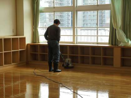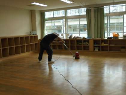 29日(月)、主事さんたちが各教室のワックスがけを始めました。先週までに、机といす、大型テレビなどを廊下にみんなで出しました。まずは、床の水洗いからスタートです。長靴を履いて、機械を操作していました。子どもたちの使った教室をピカピカに磨きあげようとしています。