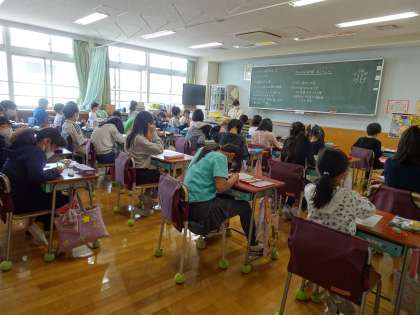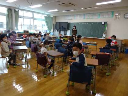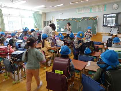 帰りの支度をして、帰りの会をします。今日の1日の振り返りや、明日の連絡をしています。2年生は、支度が速くなりました。自分から動くことができる人が増えました。自ら考えて動く力がついたということです。1年生も手早く帰りの支度ができるようになりました。