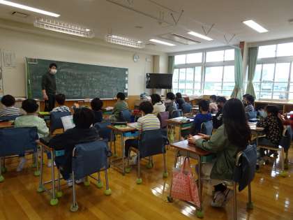社会や理科のオリエンテーションをしています。「今年1年、どのような授業をするのかな。」教科書全体を眺めて、いろいろな発見をして、学習の見通しをもとうとしていました。たくさんの気付きを、黒板いっぱいに書いていました。