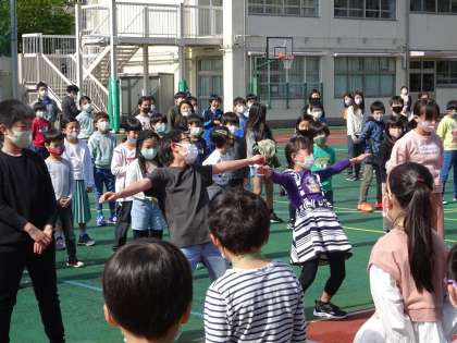 5年生による全校エールです。中里のチームワークを見せてくれました。1年生は、嬉しそうに手拍子をしていました。どの学年のどの子も、皆いい笑顔でした。