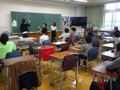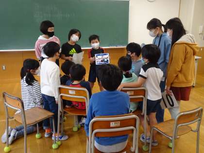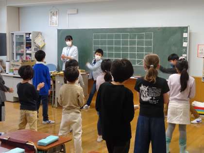 1年生を迎える会のエールの練習です。たてわり班は、1年生から6年生まで、12班に分かれて活動します。この日は、5年生がエールの交換の練習リーダーを務めてくれました。