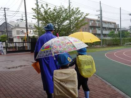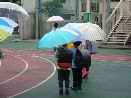 1年生は、初めて雨の日の登下校を経験しました。傘立てにしまう方法、傘立てから傘をとり、自分の力で準備する方法、上手にできました。安全第1です。ご家庭でも練習をお願いいたします。