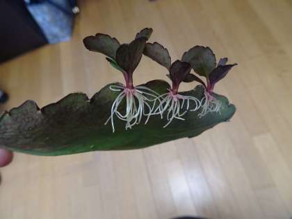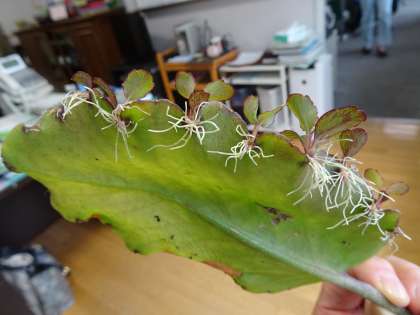 この葉っぱはなんという葉っぱでしょう。葉っぱに根っこがはえてきます。小笠原諸島で見られます。この後どのように育てたらよいか、誰か教えてください。