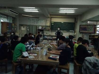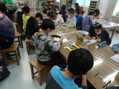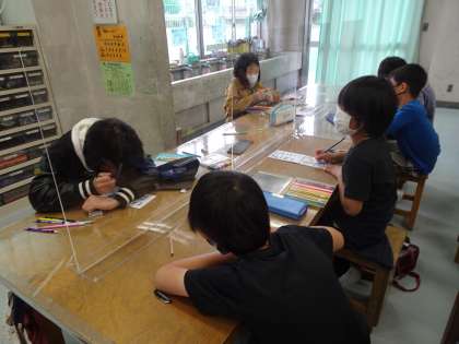 図工で、自分の名前をレタリングして素敵なデザインにしている5年生。なかなか個性的な作品が出来上がりました。新しい図工の先生と楽しそうに学ぶ様子が見られました。