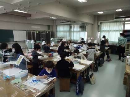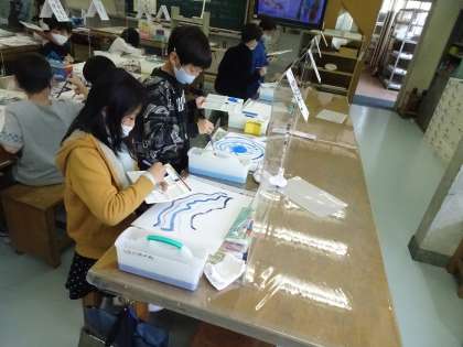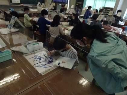 絵の具の使い方を勉強しています。同じ色でも、水の量や、筆の使い方で、おもしろい個性が表現されました。たくさんの表現がコラボレーションしています。