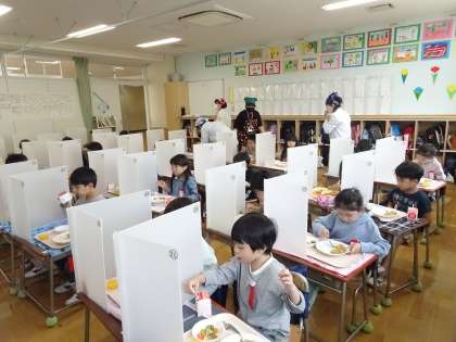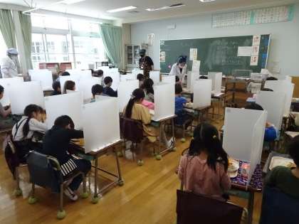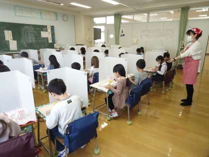 1年生の初めての給食です。地域の方が2名、お手伝いに来てくださいました。学校支援コーディネーターさんたちです。「今日はカレー?」と配膳の前から、子どもたちの心は、ワクワクしていました。パーテーションのセッティングもスムーズに進みました。(コーディネーターさんの言葉より)