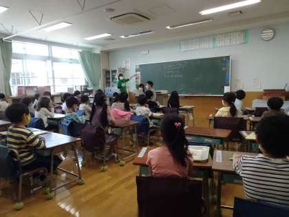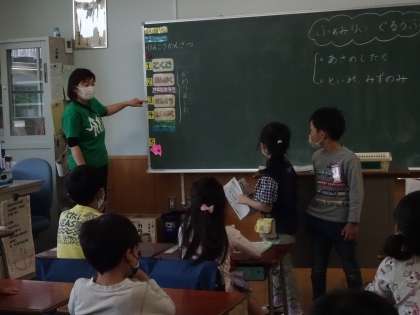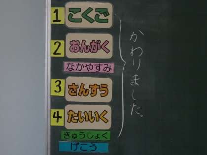 日直の仕事が書かれたカードを読み上げながら、自分の目で時間割を見て連絡をします。全体に聞こえる声で話す練習でもあります。今日の1日の見通しを理解する練習でもあります。