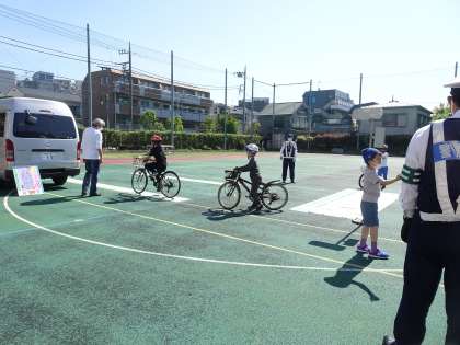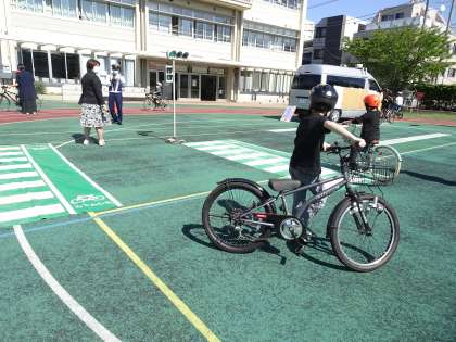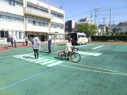 家から自転車を持ってきた3年生。警察官にご指導を受け、信号や横断歩道でのマナーをしっかり教わりました。