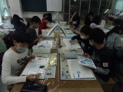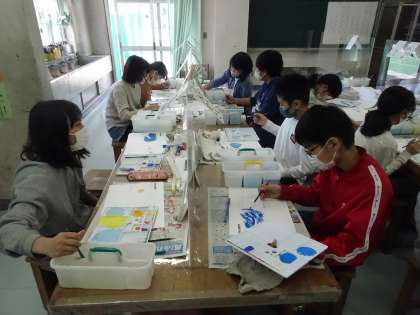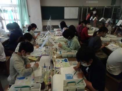 6年生の図工の授業です。色の線の探求をしています。同じ色でも、いろいろな味があります。できた色も、個性的でした。良く集中している様子がわかります。