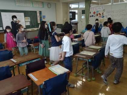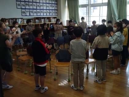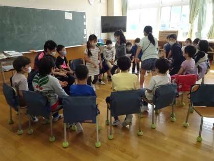 予想以上にファミリーグループを楽しんでいる子どもたち。元気に教室を出て、自分のもう一つの教室へと移動しています。今日は、コミュニケーションタイム第3回。アドジャン、ビンゴ、ジャンケンゲーム、いろいろなパターンがあります。段々と慣れてきました。先生も、必死で名前を覚えようと頑張っています。
