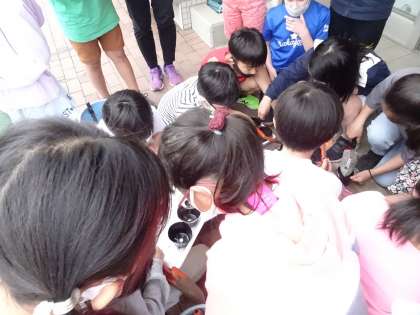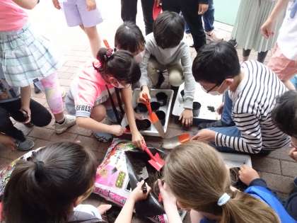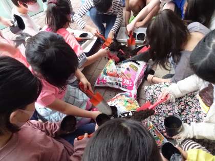 自分のポットに、へちまの種を植えました。土を運ぶ人、シャベルを持ってくる人、力を合わせて準備をしている姿に、頼もしさを感じました。育つのが楽しみです。