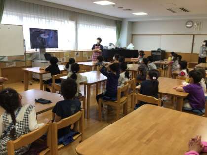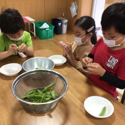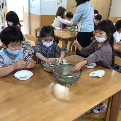 1年生の生活科の授業で、食育を行いました。グリンピースをさやから取り出すお手伝いです。ランチルームも十分消毒し、一人一人よく手を洗い、栄養士さんのご指導の元、実施しました。今日のご飯はグリンピースご飯です。